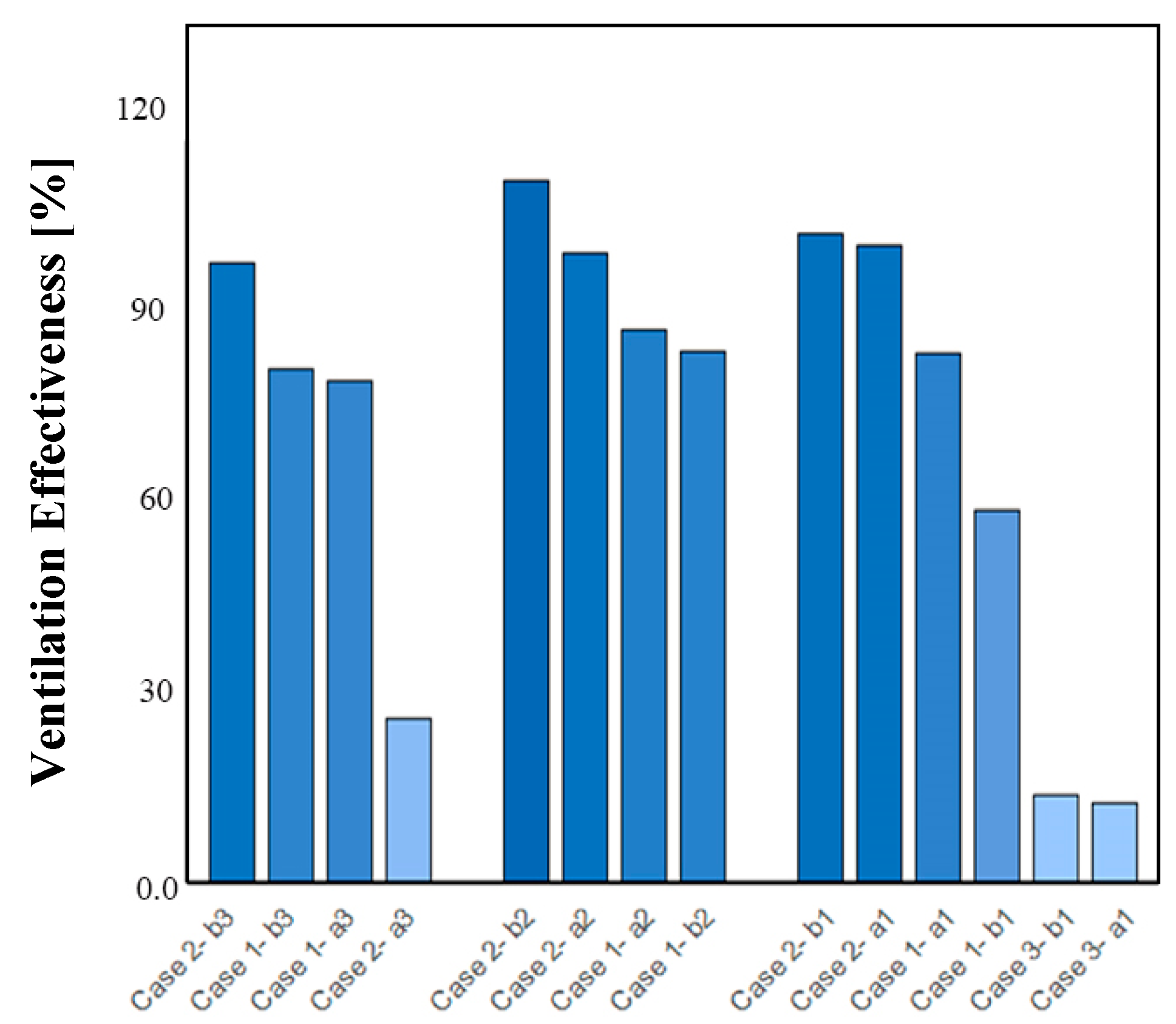 According to ASHRAE, ventilation effectiveness (VE) is defined in terms of contaminant removal effectiveness, which measures the efficiency of a ventilation system in reducing the concentration of airborne pollutants [1]. The air distribution system has a crucial role in the performance of ventilation, contaminant removal, and indoor air quality [2]. For evaluating the performance of ventilation, an assessment index is defined to measure ventilation effectiveness across different areas within a room [3]. Ventilation efficiency can be assessed by calculating the ratio of the contaminant concentration at specific points, which is a quantitative measure of how effectively the ventilation system dilutes contaminants. The ventilation effectiveness of the system is directly influenced by the air distribution, which governs how contaminants (CO2) are transported and removed from the breathing zone [4].