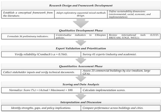 This study used an exploratory sequential mixed-methods design to evaluate sustainability practices in newly constructed commercial buildings in Ethiopia. An indicator-based assessment approach was adopted due to the lack of a national rating system, ensuring flexibility and local relevance. The research was carried out in both methods: first, qualitative methods such as expert consultation and literature review were used to develop and validate indicators using the Relative Importance Index; second, quantitative methods were applied to assess sustainability implementation in 23 selected buildings.