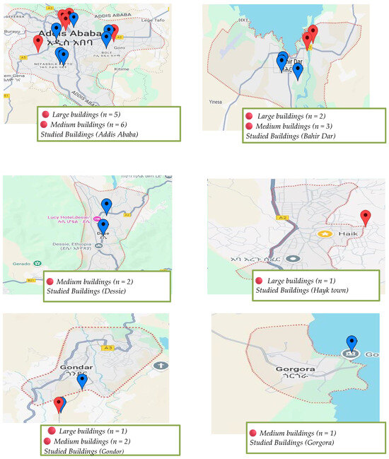 A purposive sampling method was applied to select 23 commercial buildings located in major urban centers, including Addis Ababa, Bahir Dar, Gondar, Gorgora, Hayk, and Dessie. The selection criteria considered building type, construction status, sustainability features, and gross floor area. The sample comprised 10 office buildings, 7 mixed-use developments (combining office and retail functions), 4 retail buildings, and 2 hotel or resort buildings, reflecting the diversity of Ethiopia’s urban commercial construction sector. Among these, 16 buildings were completed and operational, while 7 were recently completed or in the final finishing stages. Based on national classification, 14 buildings were categorized as medium-scale (5000–20,000 m2 gross floor area) and 9 as large-scale (>20,000 m2).