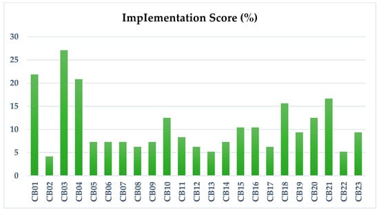 To evaluate the practical application of sustainability principles in commercial buildings, implementation scores were calculated for the 23 buildings using the standardized scoring framework. Each building was assessed against 24 validated indicators, with total scores normalized to a percentage scale ranging from 0% (no implementation) to 100% (full implementation).