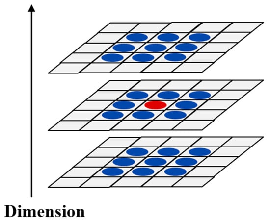 New values are obtained by calculating the difference between the results of two adjacent layers. After constructing the DoG pyramid structure, each candidate feature point in the pyramid is compared with its 26 neighboring points in the same, above, and below scales, as shown in Figure 1. The red dot represents the candidate point, and the blue dots represent the comparison points. Only if the red point is either greater than or less than all the blue points is it detected as a keypoint.