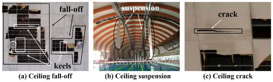 Most of the keypoint detected in the scale space are discrete, with limited accuracy and stability, particularly in complex environments where ceilings have sustained damage caused by an earthquake, which exacerbates the decline in the accuracy and stability of keypoint detection. This is because ceiling damage has produced new features or obscured existing features for ceilings. For the three types of damaged ceilings caused by an earthquake []. As shown in Figure 2a, the ceiling fall-off will create large, dark areas and expose grid-patterned ceiling keels, introducing new features that are distinct from the ceiling’s light-colored, smooth surface. For the ceiling suspension, as shown in Figure 2b, the suspended portion of the ceiling will obscure the ceiling behind it, thereby creating interference. The crack damage will lead to a change in the ceiling arrangement pattern, as shown in Figure 2c.