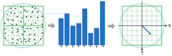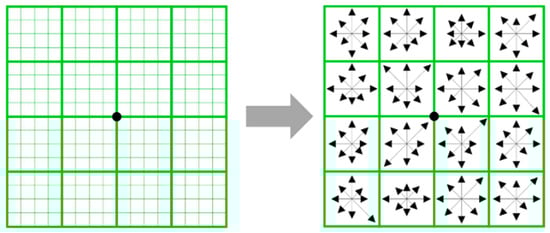 A feature descriptor is a representation of an image or an image patch, simplifying image information by extracting useful details and filtering out redundant data. In this study, feature descriptors are generated by computing gradient information within the region surrounding each feature point, thereby capturing the position, orientation, and scale of the key feature point, as well as the gradients of neighboring pixels. For example, within a 16 × 16 neighborhood centered on a feature point, as shown in Figure 4, interpolation is performed for each of the 4 × 4 equally sized subregions, resulting in a feature descriptor of 4 × 4 × 8, or a total of 128 dimensions.