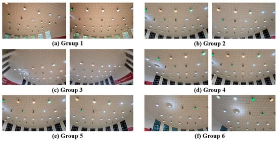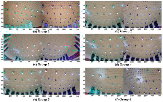 Six sets of stitched images were created using ceiling images taken from different angles in a basketball gymnasium in Tianjin, China. Each set consists of a target image and an image to be registered, as shown in Figure 5. The images were captured using a Xiaomi 13Pro smartphone manufactured by Xiaomi Corporation (China) under natural lighting conditions, and the image dimensions were uniformly adjusted to 1138 × 640.