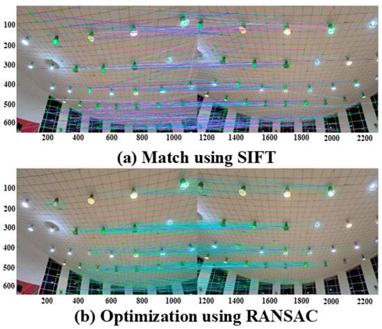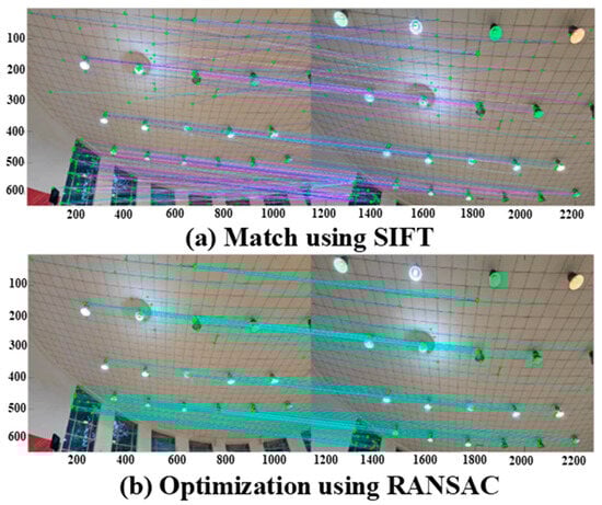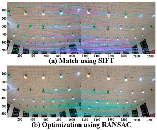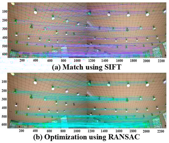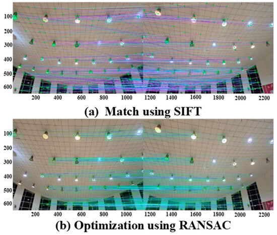 Image stitching [] is a technique that combines multiple images with small fields of view and low resolution in overlapping regions into a single panoramic image with a wide field of view and high resolution. This process is essential for achieving high-precision image recognition in wide-area scenarios. Within image stitching technology, image registration is a crucial step in the stitching process, as it significantly impacts the quality of the resulting panoramic image. Among the various algorithms [,,], the Scale-Invariant Feature Transform (SIFT) algorithm demonstrates outstanding accuracy and robustness, making it particularly well-suited for large-area damage detection that requires high-precision matching. With the continuous advancement of the SIFT algorithm, variants optimized by the RANSAC algorithm have been developed for SIFT [,]. In this approach, the SIFT algorithm is used to extract and match features between two images, generating initial candidate matches. The RANSAC algorithm then processes these SIFT matches to filter out a large number of outliers caused by incorrect matches and selects reliable corresponding points. The combination of the SIFT and RANSAC algorithms significantly enhances the accuracy and reliability of feature extraction and matching in images. At present, image stitching technology has been gradually applied to wide-area damage detection for large infrastructure in civil engineering, achieving excellent recognition accuracy and detection efficiency in applications such as surface damage detection of large-scale buildings [,,], crack detection on bridge decks and large concrete columns [,,,], and long-distance damage detection in tunnels []. Therefore, given the successful application of image stitching technology for wide-area damage identification in civil and structural engineering, high-precision local damage detection techniques for ceilings can be integrated with image stitching methods to enable panoramic post-earthquake damage identification and safety assessment of ceilings in large public buildings.