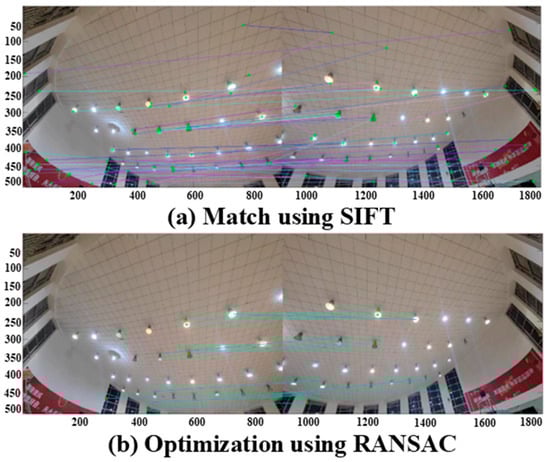The specific challenges associated with keypoint detection on the ceilings of large public buildings include pattern repetition, texture absence, and complex lighting conditions. In modern buildings, the surfaces of most ceilings are smooth and uniform in color, lacking rich textural features. Additionally, the ceiling layout employs a highly repetitive arrangement. To meet indoor lighting requirements, the lighting equipment is typically installed in the ceiling area, resulting in complex and variable lighting conditions. To address the challenges posed by pattern repetition and textureless surfaces in ceiling images, the SIFT algorithm was used to extract feature points from both the target images and the images to be registered in each group. On one hand, the SIFT algorithm is insensitive to factors such as image aspect ratio, rotation, scaling, and brightness variations, making it well-suited for handling the challenges of pattern repetition and complex lighting conditions. On the other hand, this algorithm exhibits strong robustness against viewpoint shifts, affine transformations, and noise, which helps address issues arising from the absence of texture on the ceiling surface.