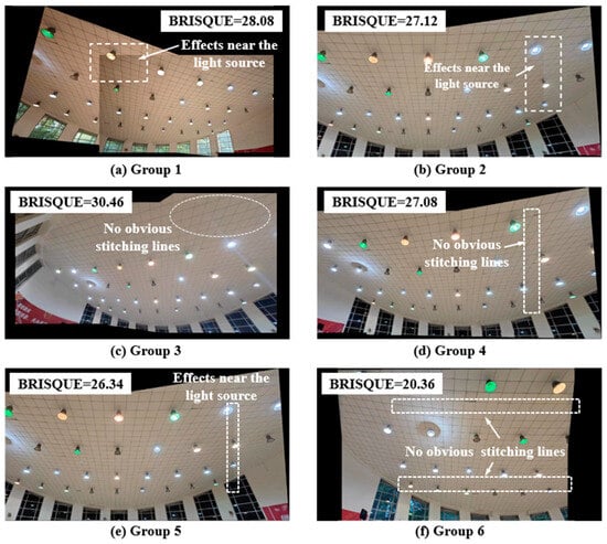 The quality of the stitched images was evaluated using the BRISQUE image quality assessment metric, as shown in Figure 13. The BRISQUE values for all sets of stitched images are around 20 to 30, indicating good stitching performance []. Compared to the other four stitched images, the stitching lines in Figure 13a,b are more noticeable. This is because the stitching lines either pass through or are very close to ceiling light sources, and they are mostly located at the image edges in the original images. Therefore, images taken from different angles can have significant color differences, resulting in more prominent stitching lines in the final stitched images. In Figure 13c–f, the stitched images do not exhibit problems of blurring or feature artifacts caused by the projection transformation, and the image edges are unaffected by the light source. This effectively reduces the appearance of stitching lines at the edges of the image overlap area, caused by varying light sources and shooting angles, resulting in a very smooth overall stitching effect. Taking both the BRISQUE evaluation metrics and the visual results of the stitched images into account, all the stitched images show excellent alignment of overlapping regions, smooth transitions between stitched ceiling panel areas, and clear, undistorted straight edges at the panel borders, with good registration in terms of contrast, brightness, and structural features. The stitching lines that appear in Figure 13a,b only affect the brightness in local areas and do not cause geometric distortion or deformation, thus not affecting the identification of earthquake-induced damage to the ceiling. In summary, the panoramic image stitching method, based on SIFT feature point detection and registration and optimized with the RANSAC algorithm, meets the application standards for natural images and demonstrates excellent performance in stitching images of suspended ceiling areas.