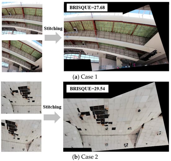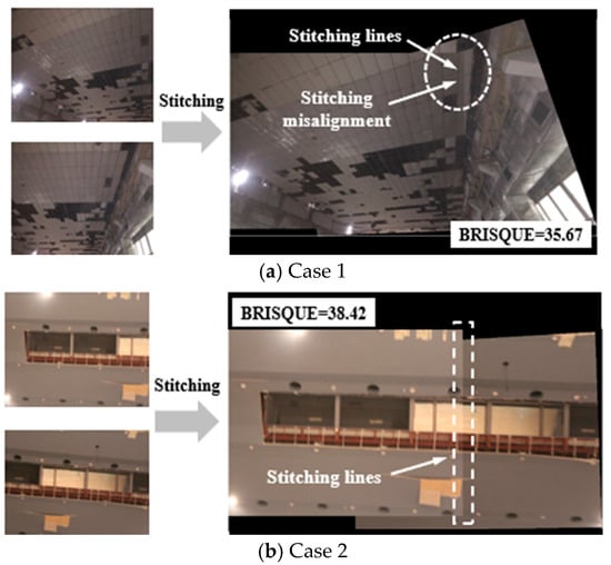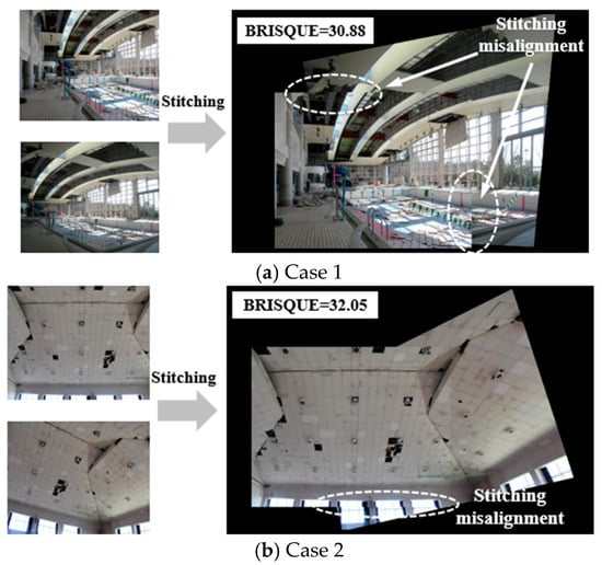 The images of earthquake-induced ceiling damage were sourced from post-earthquake photographs taken by the Kawaguchi Lab during damage surveys of buildings, such as gymnasiums, swimming pools, and exhibition halls, which were used as shelters following the 1995 Great Hanshin-Awaji Earthquake in Japan []. The image set comprises a total of 1953 photos [], from which the authors selected 423 images to form 227 image pairs. First, two images capturing the same ceiling area can form one pair. Then, the image pair capturing the same ceiling area must have over 60% overlapping regions to ensure sufficient feature points. Using SIFT feature point detection and registration optimized with the RANSAC algorithm, 227 groups of images from the stitching test set were processed. The computation processing time for each stitched image is from 1 to 5 min, corresponding to ceiling areas ranging from 720 m2 to 4500 m2. Combining two evaluation metrics of stitched time and ceiling area, the average computation time for processing a ceiling stitched image is 0.06 s per m2 of ceiling area. The BRISQUE values of 227 stitched images range from 26 to 39, with an average of 32.6. The average BRISQUE values of the test set are slightly higher than those of the initial tests in Section 3.1, which indicates the presence of stitched images with poor stitching quality. Therefore, based on different BRISQUE value ranges, a detailed analysis of the quality of stitched images and their impact on damage identification and safety assessment is conducted. As shown in Figure 14, stitched images with lower BRISQUE values (186 groups, accounting for 67% of the test set) demonstrate clear and accurate feature point registration, smooth fusion and transition in overlapping regions, and no obvious stitching lines, effectively avoiding problems such as blurring and artifacts and exhibiting excellent stitching performance. As the BRISQUE value increases, the quality of image stitching declines. For example, Figure 15 shows typical stitched images with BRISQUE values between 30 and 35 (63 groups, or 23% of the test set), where some images present local stitching misalignments. This is the main reason for the higher BRISQUE scores. Upon examination, misaligned areas are typically found in non-ceiling regions with bright colors, such as sunlit window areas, or in dark regions within the ceiling, like black voids left by fallen ceiling panels. These areas have very few keypoints for matching due to extreme brightness or darkness, resulting in poorer stitching quality. From the perspective of ceiling earthquake damage applications, local stitching misalignments occurring in non-ceiling regions do not affect the ceiling area and are not part of the damage region, thus having no impact on identifying earthquake damage in the ceiling. Local misalignments within the ceiling area are observed in the dark voids left by fallen ceiling panels. These misalignments do not affect the characteristics of the fallen ceiling damage and, therefore, do not impact the identification of earthquake damage. With further increases in BRISQUE value, 28 groups of stitched images have BRISQUE values between 35 and 39 (approximately 10% of the test set), as shown in Figure 16. These images exhibit more noticeable stitching lines and local misalignments. Such images were typically taken in poor lighting or with overexposure, resulting in lower image quality and reduced accuracy in keypoint matching. However, regarding ceiling damage features, the stitched images retain all the characteristics of the ceiling area and its earthquake-induced damage, allowing the damage type and area to be identified visually. In principle, this should not have a significant impact on the accuracy of damage recognition models and safety assessments. When taking photos, it is recommended to shoot in environments with natural lighting and avoid overexposure.