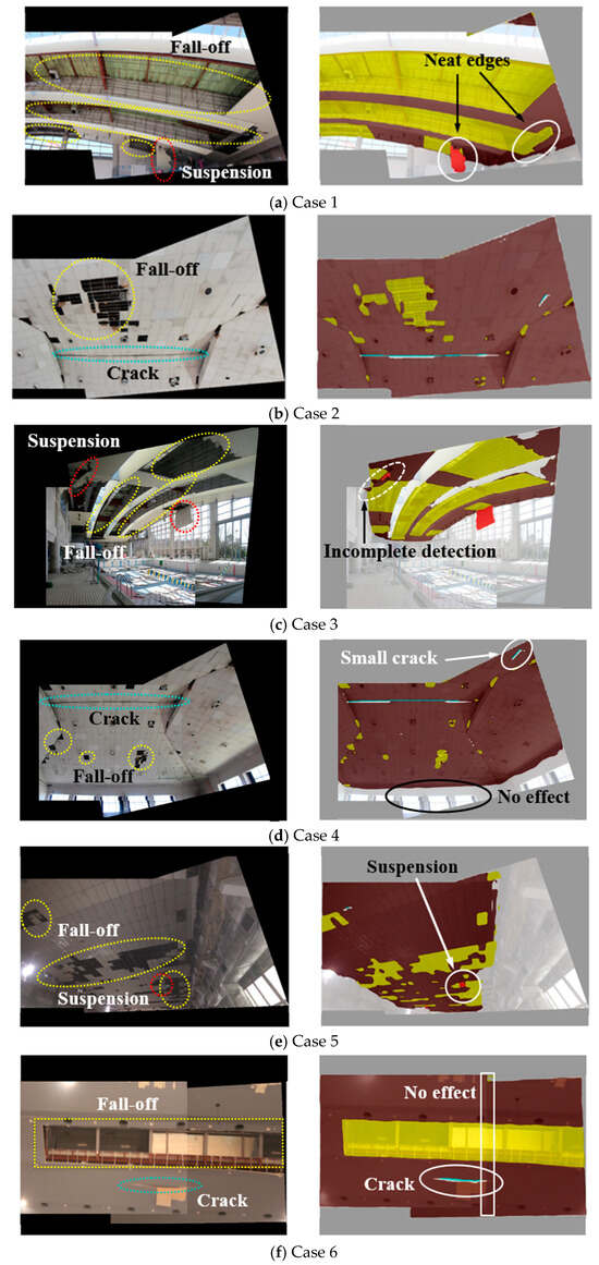 In summary, when the BRISQUE value of a stitched image is less than 35, the method enables the precise identification and localization of three types of ceiling damage—fall-off, suspension, and crack—with minor pixel-based quantitative errors. When the BRISQUE value exceeds 35, detection errors increase but remain under 30%; however, this increased error does not affect the overall accuracy of the safety assessment. An accuracy rate of 98.7% for safety assessments has been obtained.