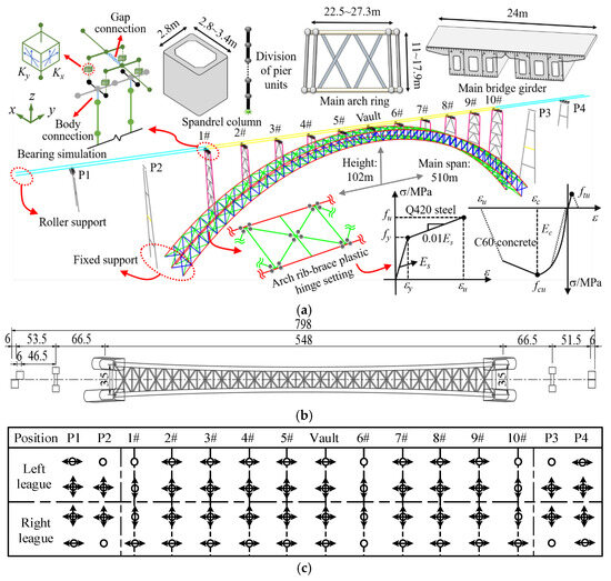 SAP2000 is utilized to build a three-dimensional finite element model (FEM) of the whole bridge. Frame elements are adopted to simulate transverse braces, arch columns, transition and approach piers, and the main girders, with the second-order effect of compression members considered. The CFST is considered to be an equivalent conversion section [26]. The bearing adopts decoupled spring elements to simulate two horizontal stiffnesses, with a vertical bearing capacity of 12,000 kN and a horizontal stiffness of 12,500 kN/m. The collision of the main girder at the expansion joints is simulated using gap elements. The initial gap is 6 cm, and the collision stiffness is approximately 106 kN/m according to the axial stiffness of the main girder. To account for the influence of material nonlinearity, fiber plastic hinges are introduced at the junctions of the arch rib, arch columns, and transverse braces. Figure 1a displays a material constitutive model of the steel tubes and the concrete within arch ribs [27]. Specifically, the steel tube exhibits a yield stress of 420 MPa, while the concrete filled in the tube shows a compressive strength of 60 MPa. The mass of the bridge deck pavement, as well as other ancillary structures, is applied as the uniform load onto the main girder. In time-history analysis, these loads are converted into mass for computational purposes. The rock foundation at the bridge site is primarily composed of granodiorite, with favorable geological conditions. The arch foot and the pier bottom are modeled with consolidation constraints. In nonlinear time-history integration, the Rayleigh damping model is adopted, with a damping ratio of 3% [28,29,30].