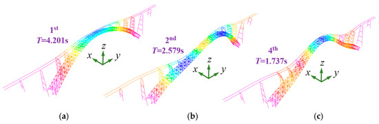 Typical vibration modes of the bridge. (a) Mode 1, transverse vibration. (b) Mode 2, longitudinal vibration. (c) Mode 4, vertical vibration.