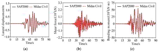 The modal and vibration mode results obtained in this study are essentially in agreement with those derived using the Midas Civil software model in reference [31]. To evaluate the nonlinear dynamic performance, the representative near-fault pulse-like record TCU087-NS is selected as input ground motion. Nonlinear time-history analyses are carried out using both the SAP2000 and Midas Civil models, and their computational results are compared. As illustrated in Figure 3, the results from the SAP2000 model correspond well with those from the Midas Civil model. The maximum relative differences in lateral displacement at the arch vault, out-of-plane shear force, and out-of-plane bending moment at the arch foot are 6.1%, 4.6%, and 3.0%, respectively. These close agreements confirm that the FEM developed in SAP2000 is accurate and reliable.