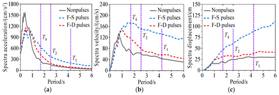 Comparison of response spectra for ground motions of different pulse types. (a) Acceleration. (b) Velocity. (c) Displacement.