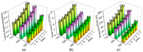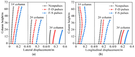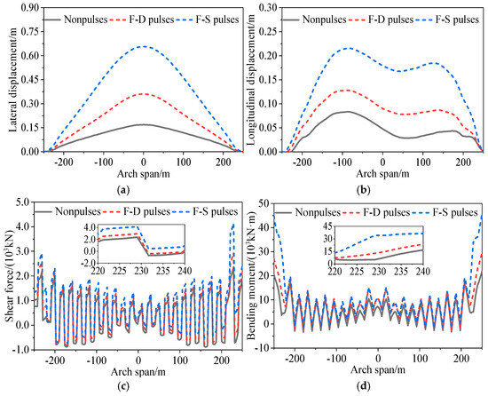 Figure 5 depicts the response envelopes for the force and displacement of the arch rib chord. The dynamic response patterns of the arch rib chord subjected to the three types of NFGMs are essentially identical. The lateral displacement of the arch rib reaches its maximum at the vault and then gradually diminishes from the vault to the arch foot, with the overall shape resembling the first-order lateral vibration mode. The maximum longitudinal displacement occurs near the 1L/4 or 3L/4 section, and the overall trend from both arch feet to the vault initially increases and then decreases. Regarding the seismic force response, the out-of-plane bending moment and the shear force along the main arch ring are not uniformly distributed due to the influence of the arch columns. Instead, they generally increase from the vault towards both arch feet and then rise sharply near the arch feet. It is evident that the dynamic response of the arch rib caused by fling-step records is generally greater than that induced by the forward-directivity and nonpulse records. In conjunction with analysis of the response spectra (Figure 4), the fling-step records exhibit significantly larger response spectra values than the other two types of records within the first-order transverse mode period range. This results in the maximum structural response under the fling-step records.