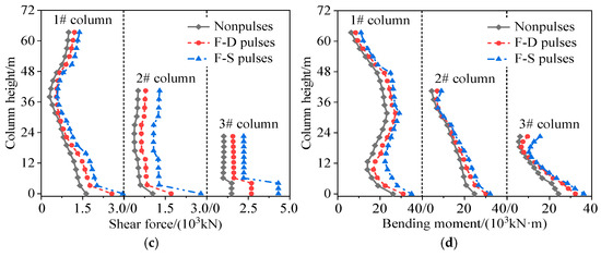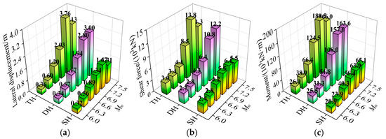 Figure 15 compares influences of the moment magnitude on dynamic responses of the arch rib. Obviously, the moment magnitude shows varying influences on dynamic responses in each critical section of the arch rib. Under single- and three-half wave pulses, lateral displacement and the out-of-plane bending moment and shear force grow at first, and then reduce as the moment magnitude rises, with the maximum response found under Mw = 7.2. However, under the double-half wave pulse, the dynamic response of the arch rib consistently improves with the increase in moment magnitude. In this case, the maximum values of lateral displacement, out-of-plane shear force, and moment of the arch rib are 7.7, 3.6, and 5.4 times higher than the minimum values, respectively. This is primarily because the low-frequency pulse period and pulse amplitude of the NFGMs increase with the rising moment magnitude [40].