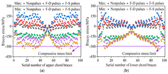 Figure 7 presents stress envelopes for braces of the arch rib chord, with Max and Min denoting the envelope values of tensile and compressive stresses, respectively. Under these three types of NFGMs, the minimum compressive and tensile stresses of the arch rib braces both appear in the vault, and then increase initially, and subsequently decrease from the vault to both sides of the arch foot. Generally, the tensile stress is lower than the compressive stress of the arch rib braces. The fling-step records induce the most significant stress response of the arch rib braces, while the forward-directivity and nonpulse records separately result in moderate and the smallest stress responses.