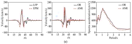 The simulated LFP velocity pulse is superimposed on the HFP of the original record (OR) to generate an artificial near-fault record (ANR). To validate the accuracy of the aforementioned synthesis method, three near-fault records exhibiting forward-directivity and fling-step effects are selected from Table 2. These records are then synthesized using the EPM for three distinct pulse types. The synthesized records are subsequently compared and verified in both the time and frequency domains.