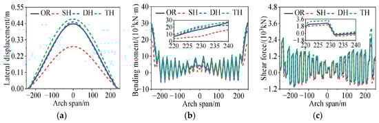 Effects of moment magnitude on dynamic responses of arch rib. (a) Lateral displacement. (b) Out-of-plane shear force. (c) Out-of-plane bending moment.