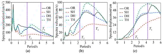 Comparison of response spectra of NFGMs with different characteristics. (a) Acceleration. (b) Velocity. (c) Displacement.