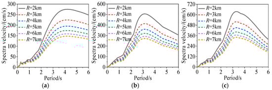 Comparison of response spectra for ground motions with different fault distances. (a) Single-; (b) double-; (c) and three-half wave pulses.