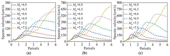 Comparison of response spectra for ground motions with different moment magnitudes. (a) Single-; (b) double-; (c) and three-half wave pulses.