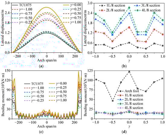 Effects of pulse superposition effect on dynamic responses of arch rib. (a) Lateral displacement of arch rib and (b) critical sections. (c) Out-of-plane bending moment of arch rib and (d) critical sections.
