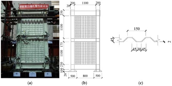 Test specimen of VCoSPSW-I []: (a) model picture; (b) dimensions of model; (c) dimensions of steel plate.