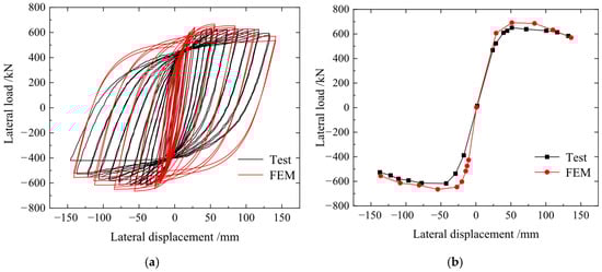 The comparisons of FEM and test results of VCoSPSW-I: (a) hysteretic curves; (b) skeleton curves.