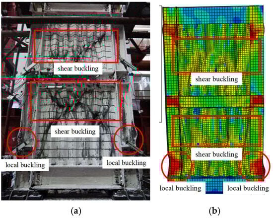 At the final loading case, the column flanges and joints were seriously damaged. At the same time, the out-of-plane deformation in the corrugated steel plates was obvious, and some parts of the plates were torn. Figure 5 shows the comparison of failure modes between the test observations and finite element analysis. The finite element method simulates buckling modes and the buckling positions of corrugated steel plates and boundary columns precisely, verifying the reasonableness of the finite element model. It is obvious that the modeling method for the PCCSW in Section 2.1 is sensible, and the method can be utilized for parametric study.
