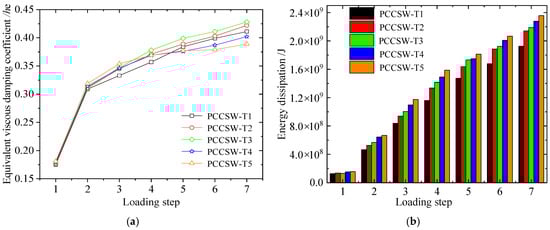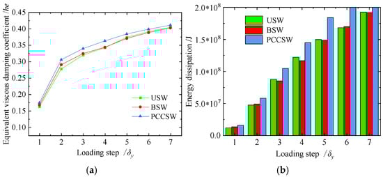 Energy dissipation capacity of USW, BSW, and PCCSW: (a) equivalent viscous damping coefficients; (b) total energy dissipation.