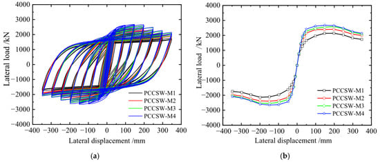 Load–displacement curve of PCCSW-Ms: (a) hysteretic curves; (b) skeleton curves.
