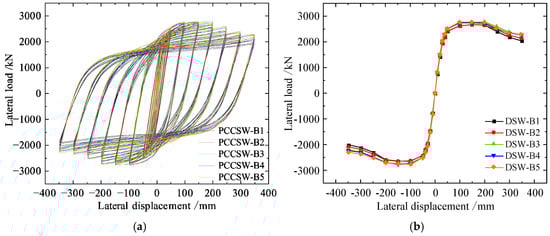 Load–displacement curve of PCCSW-Ls: (a) hysteretic curves; (b) skeleton curves.