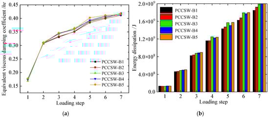 Figure 8a,b shows the energy dissipation capacity of the USW, BSW, and PCCSW. The total energy dissipation of the PCCSW increases by 23% and 20% compared to BSW and USW, respectively. The difference in total energy dissipation between USW and BSW is small. The results show that the boundary stiffeners had little effect on total energy dissipation of CSPW, but it is obviously increased by crossing stiffeners.