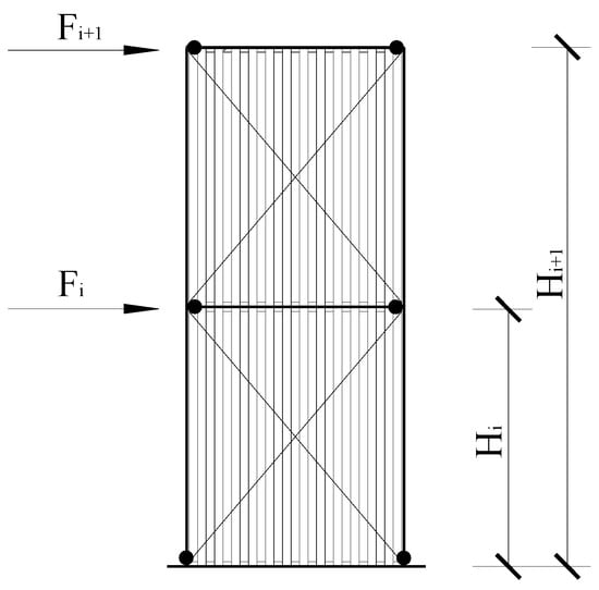 When the boundary frame of the PCCSW reaches its maximum lateral resistance, plastic hinges form at the ends of the beams and columns [,]. It is estimated that a partial tension field is formed on the BCSPW when it reaches the maximum shear resistance. A mechanical diagram of the PCCSW model is proposed based on the suggestions by Berman and Bruneau [], and it is presented in Figure 19. The shear resistance of each story of the PCCSW under the proposed mechanical model is calculated by the following []: