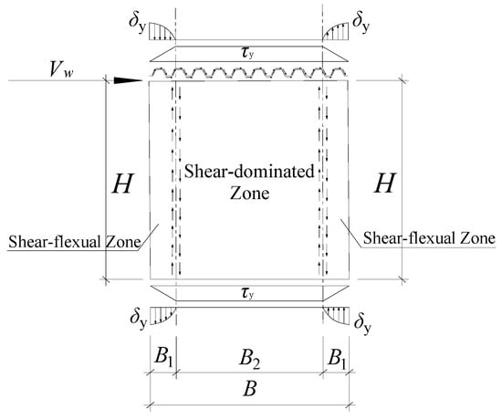 According to Tan et al. [], the boundary stiffeners could change the area of the shear-dominated zone by changing the stiffness of them, and the length of B1 can be decreased accordingly. Once the stiffness of the boundary stiffeners reaches the threshold value in Equation (10) [], all of the areas of the BCSPW can be estimated as shear-dominated zone, and B1 = 0 in this situation.