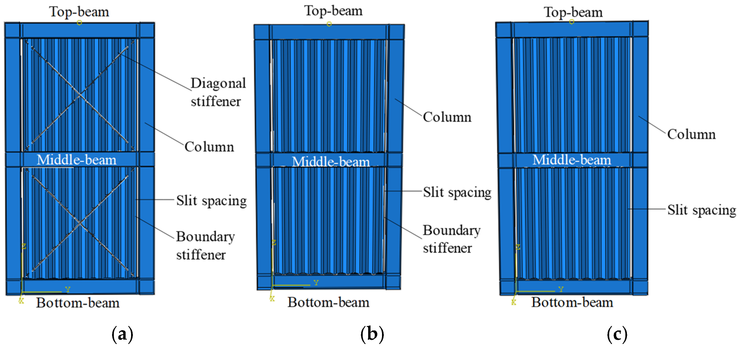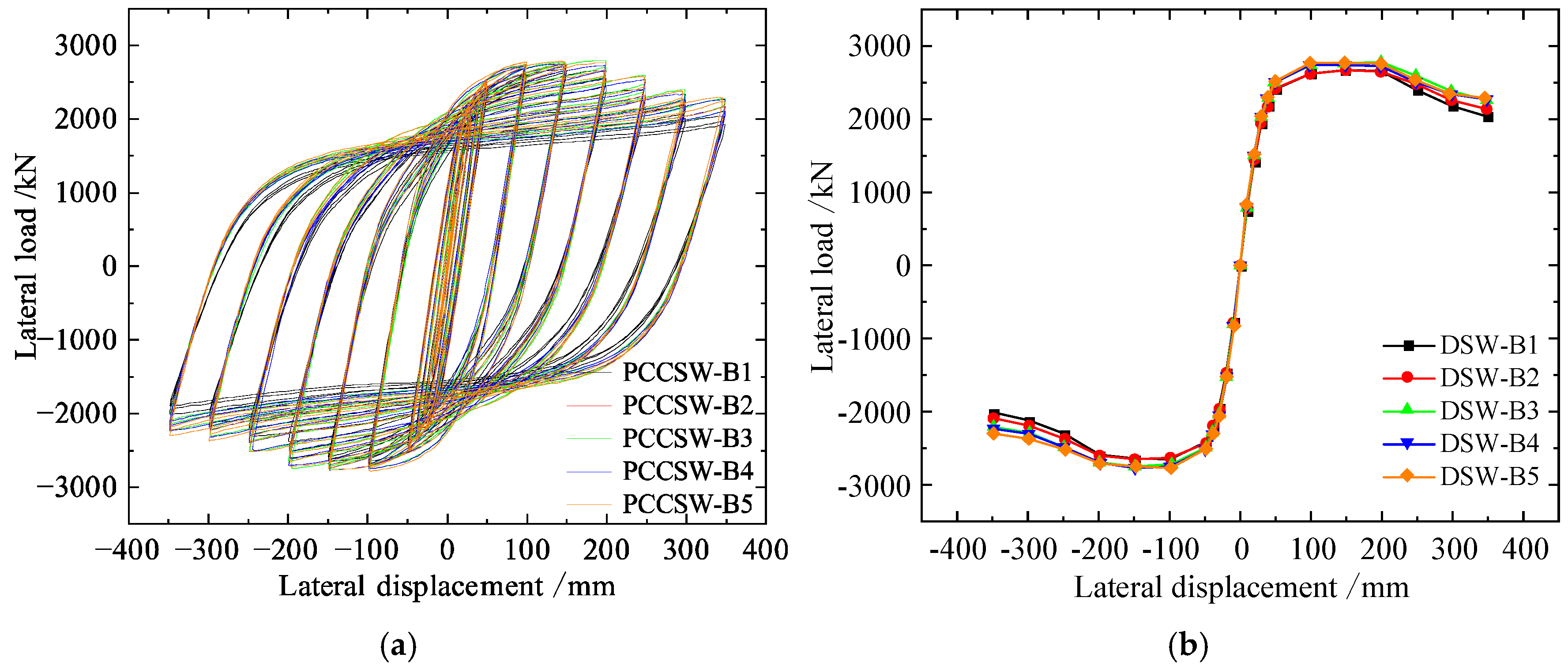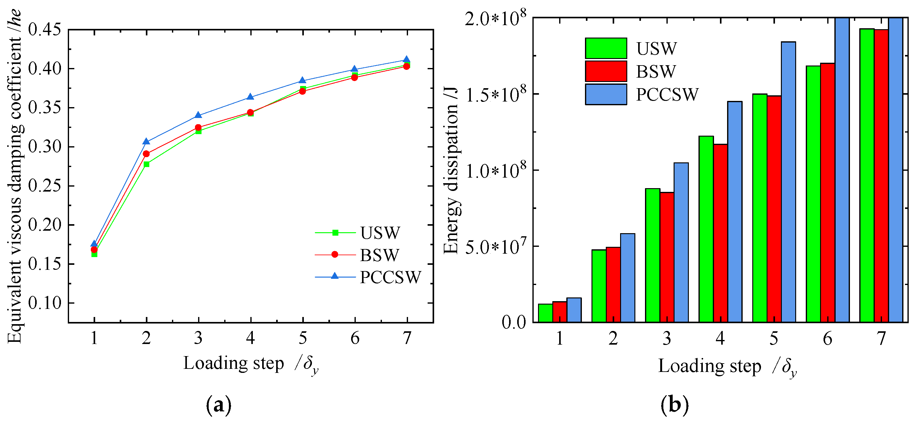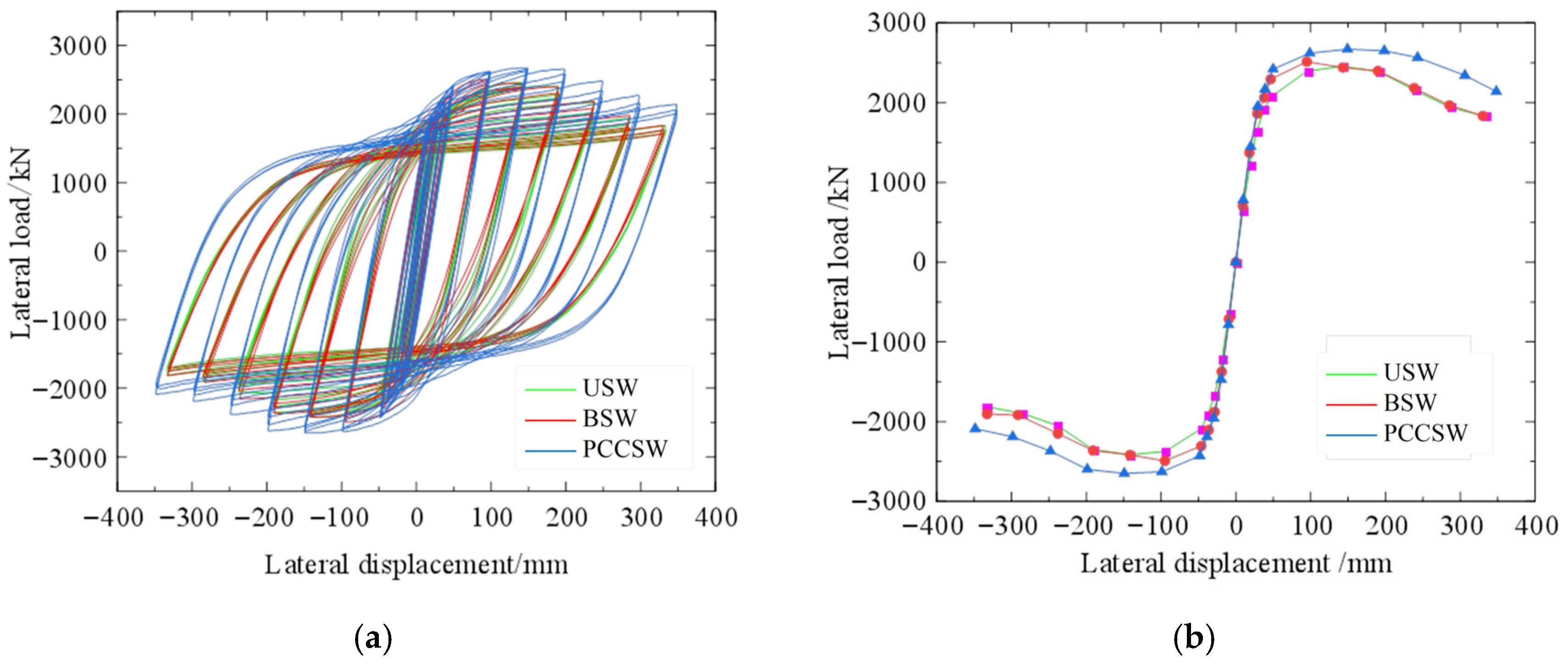 - The results analyzed by FEM show that the shear resistance, lateral stiffness, energy dissipation capacity, and ductility of the PCCSW are better than those of the USW and BSW. Compared with the values of the USW and BSW, the maximum load of the PCCSW increases by 13% and 11%, respectively; the ductility factor increases by 21% and 24%, respectively; and the total energy dissipation increases by 23% and 20%, respectively.