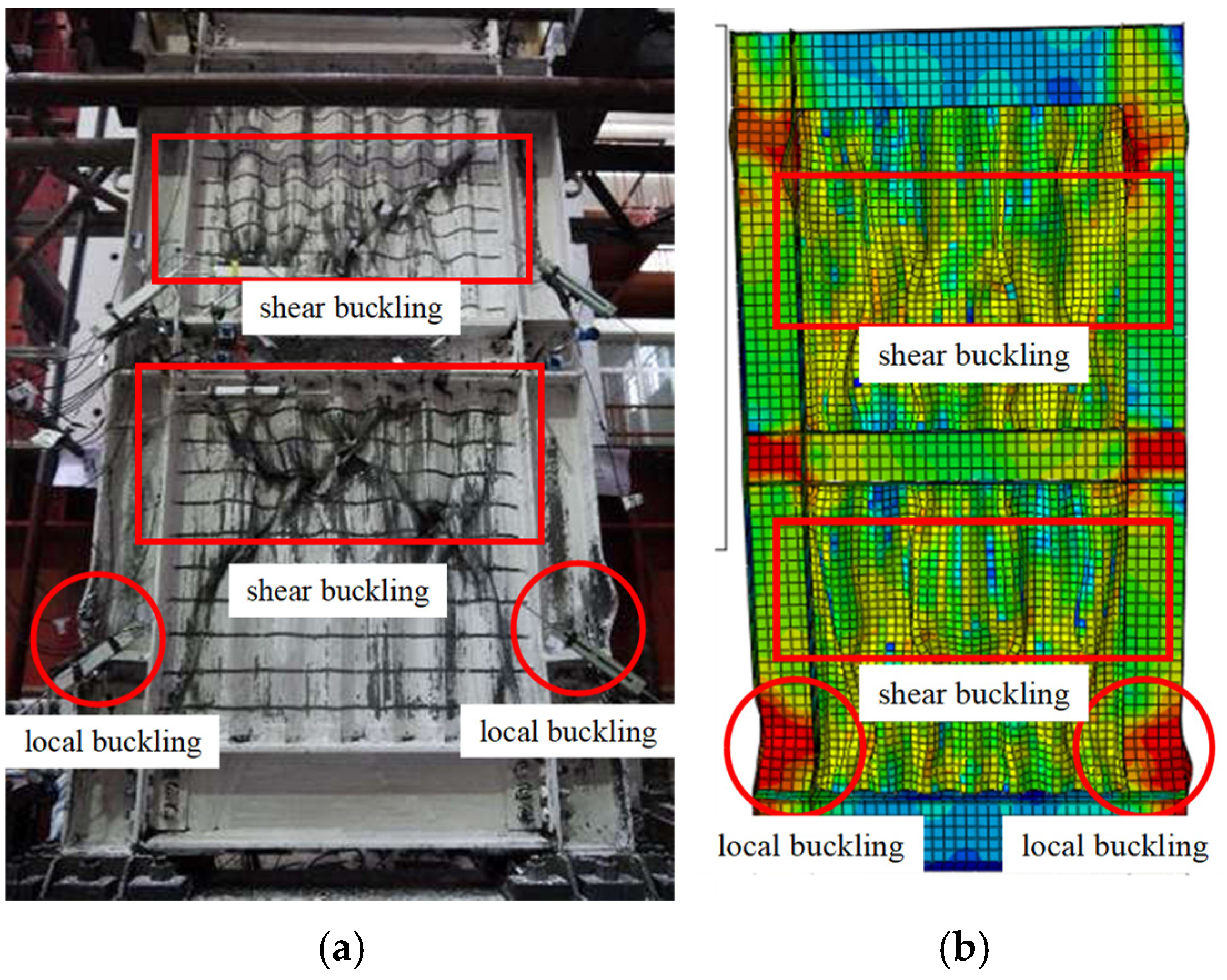 - Wen, C.; Zhu, B.; Sun, H.; Guo, Y.; Zheng, W.; Deng, L. Global stability design of double corrugated steel plate shear walls under combined shear and compression loads. Thin-Walled Struct. 2024, 199, 111789. [Google Scholar] [CrossRef]