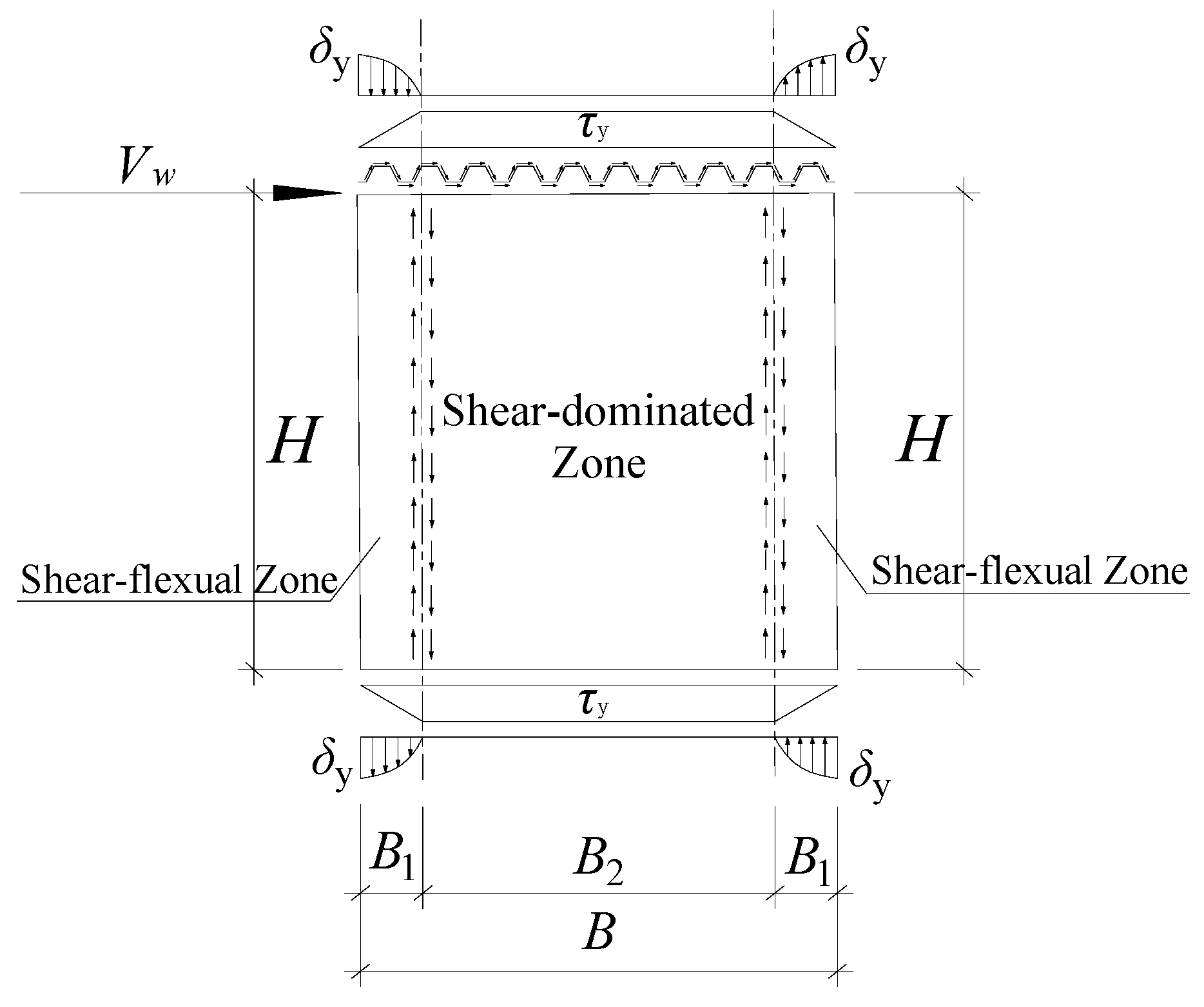 - A theoretical model of the PCCSW is put forward; then, the shear-dominated zone and shear-flexural zone are determined to describe the real state of stress of the PCCSW and thus derive the shear resistance formula of the PCCSW. At the same time, the maximum deviation between theoretical outcomes and FEM outcomes is 14.17%, the maximum deviation between theoretical outcomes and experimental outcomes is 11.08%, and the greater part of them are under 10%. Given the current comparison results and considering the limitation that physical test data remains insufficient, these findings suggest that the proposed theoretical model has the potential to reasonably estimate the ultimate shear resistance of BCSPW and CSPW.