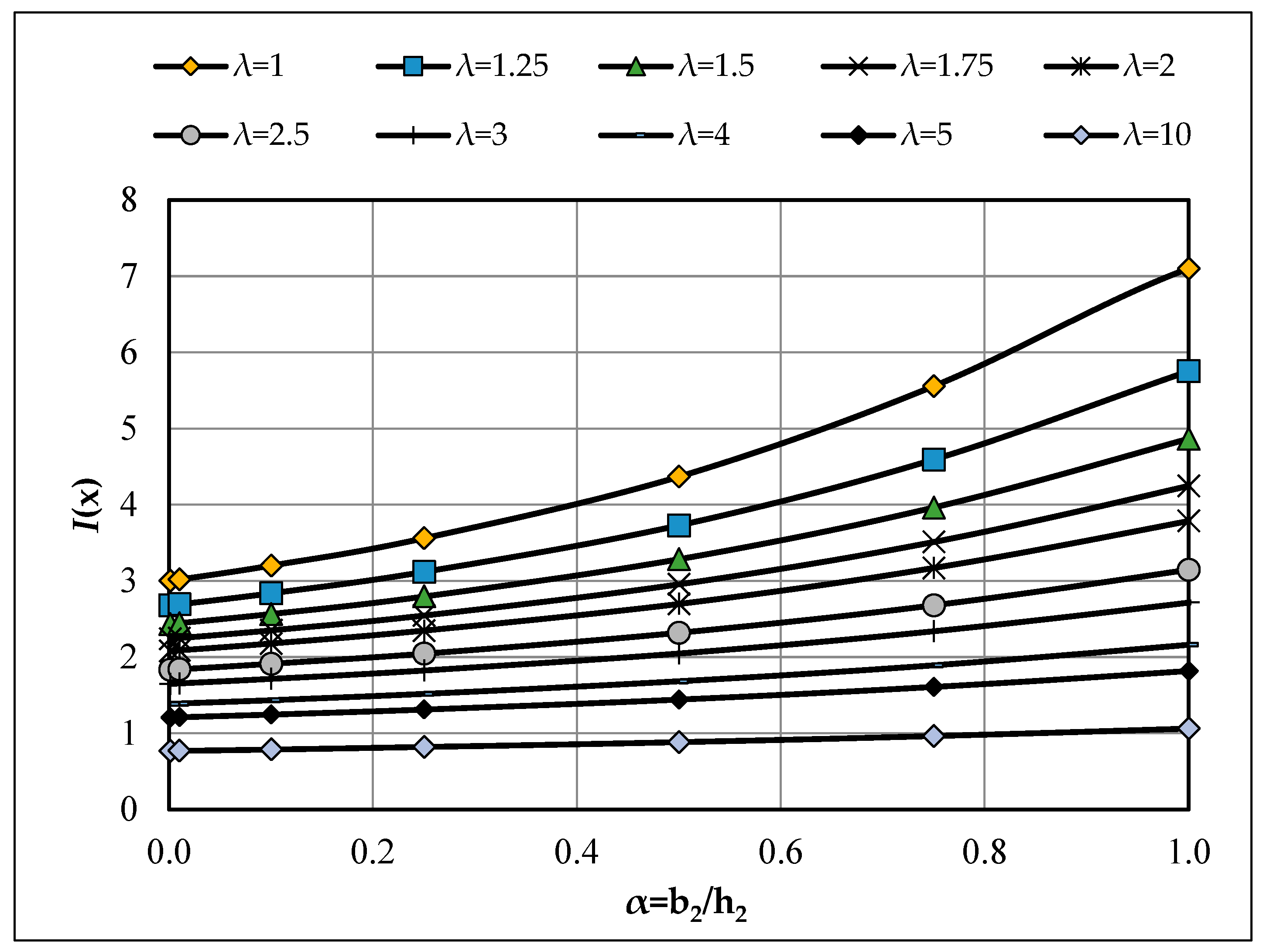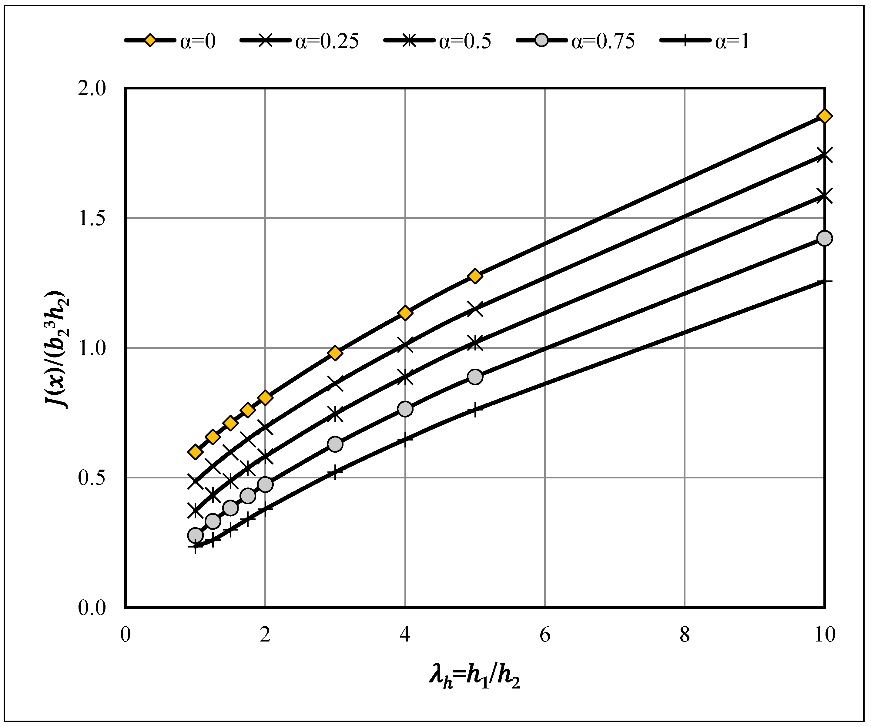 Very narrow sections (α → 0): I(x)→3 and f → 1/3 match the Saint-Venant solution for a prismatic rectangle. Accordingly, J = (b23h2)/3 in this limit.