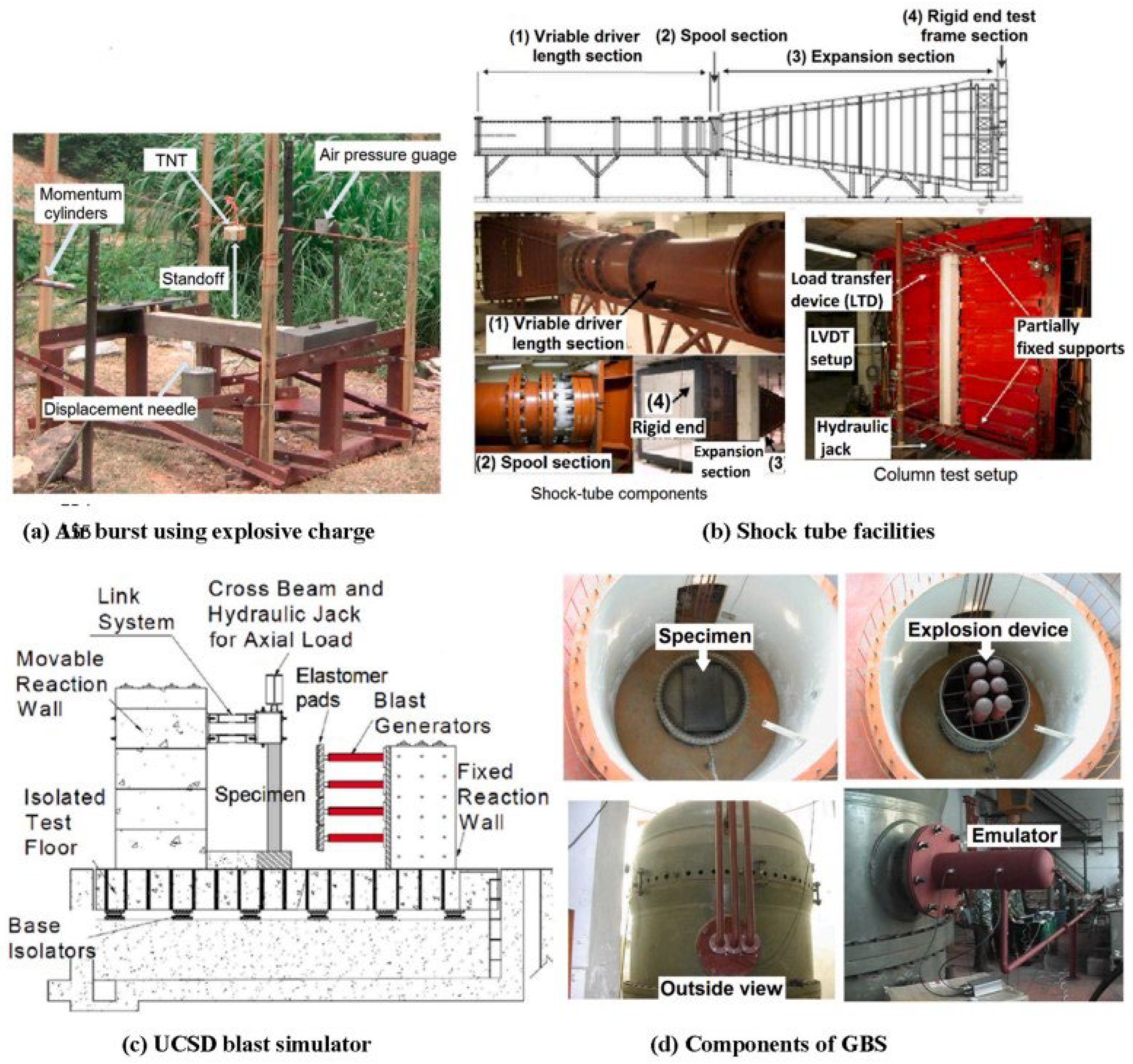 - Shock tube testing (Figure 7b [1]): Shock tubes generate high-pressure waves inside a compression chamber. These waves are then released through a variable-length driver toward the target. A differential pressure diaphragm in the spool section controls the firing. The generated shockwaves travel along an expansion section before striking the target, enabling precise study of blast effects on structures [36]. This approach helps in creating consistent and repeatable loading conditions. Instrumentation such as load cells, LVDTs, and strain gauges are used to measure responses (Figure 7b).