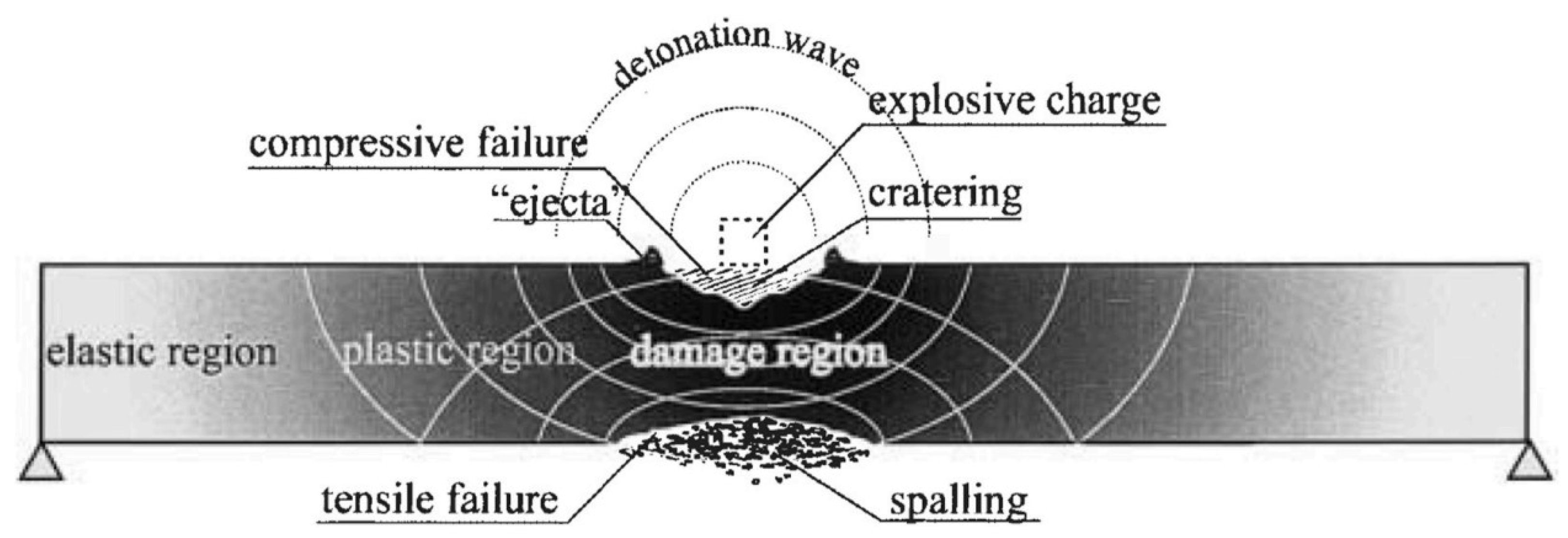 - Spalling: Material is ejected from the rear face of concrete due to high tensile stresses caused by stress wave reflections.