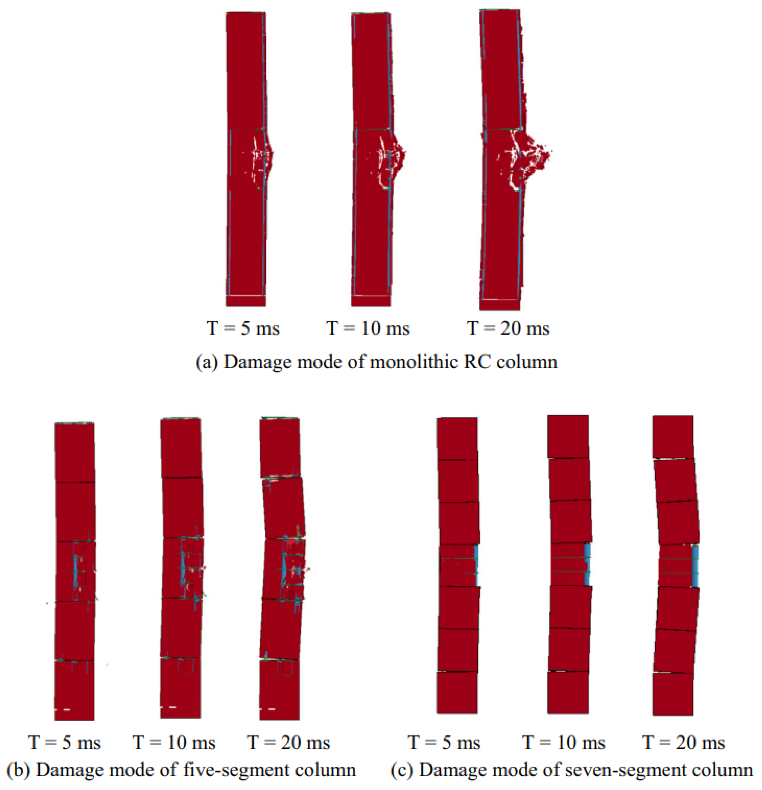 | 17 | Li et al. [83] | 2017 | Yes | Close | LS-DYNA | Mat_Concrete_Damage_Rel3 | Spall damage; displacement | 1. Stress distribution in column materials not discussed. 2. Cost comparison of segmental columns not provided. |