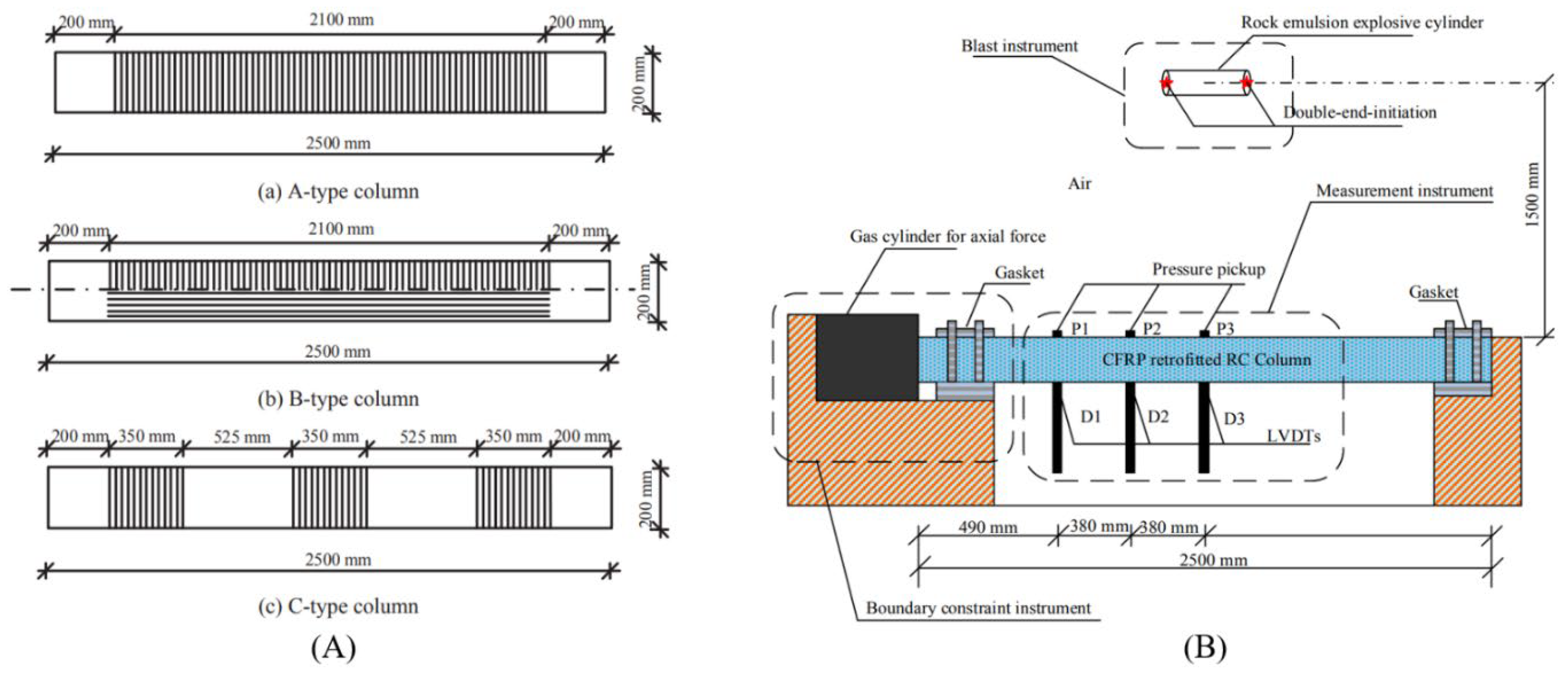 | 30 | Hu et al. [95] | 2021 | Experimental | Axially loaded, Steel test bench with pneumatic jack | 2500 | Square, 200 × 200 | 12.50 | Not specified | 50.16 | Double-end-initiation cylindrical rock emulsion | Close-in detonation | Carbon-FRP strips (0.167 mm) |