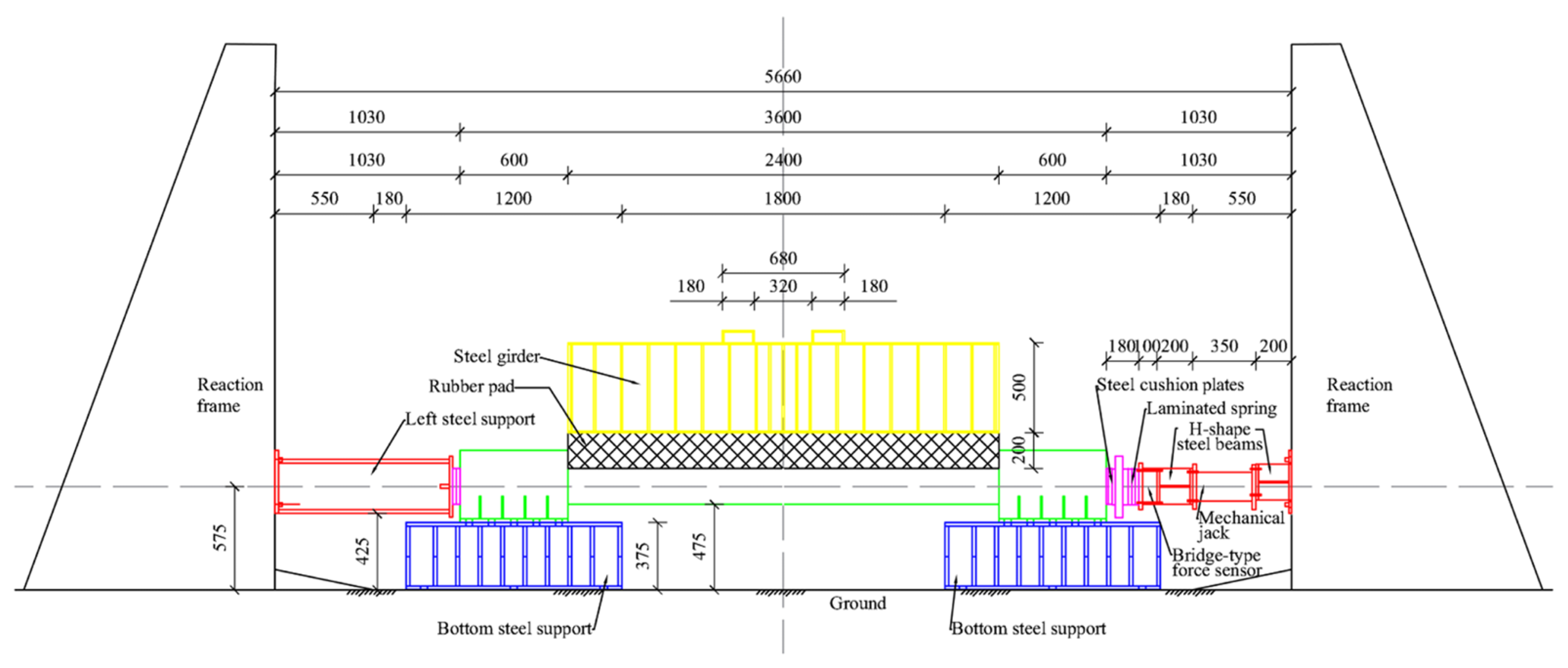 - UCSD blast simulator (Figure 7c [1]): Developed at the University of California, San Diego, this facility uses hydraulically driven actuators to mimic distributed blast loads. Elastomer pads transfer these simulated impact loads to structural specimens, providing a controlled and repeatable experimental environment [37]. The system includes both movable and fixed reaction walls, along with cross beams and connecting link systems (see Figure 7c). This setup helps in effectively confining and distributing the simulated blast loads to the structural elements. Stability is ensured by using base isolators.
