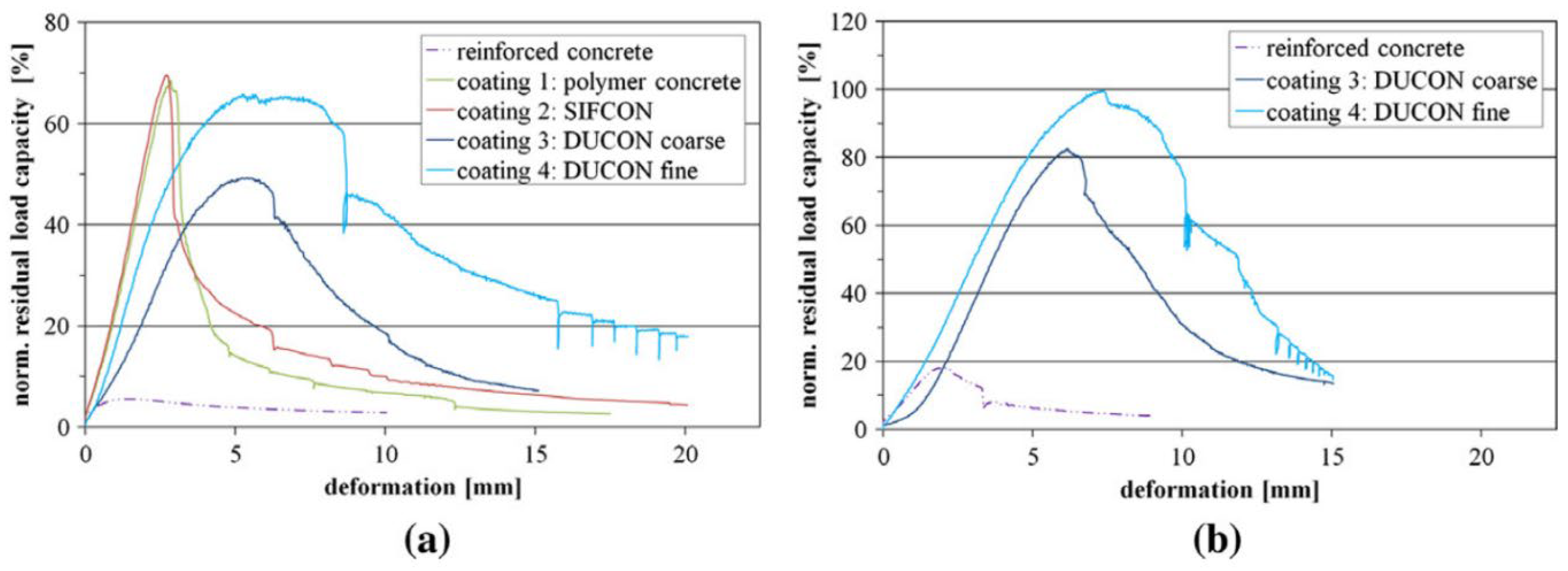 - Thin layers of energy-absorbing materials such as SIFCON, DUCON, and UHPC significantly improve residual load capacity, with SIFCON-coated columns showing the best performance under contact blasts.