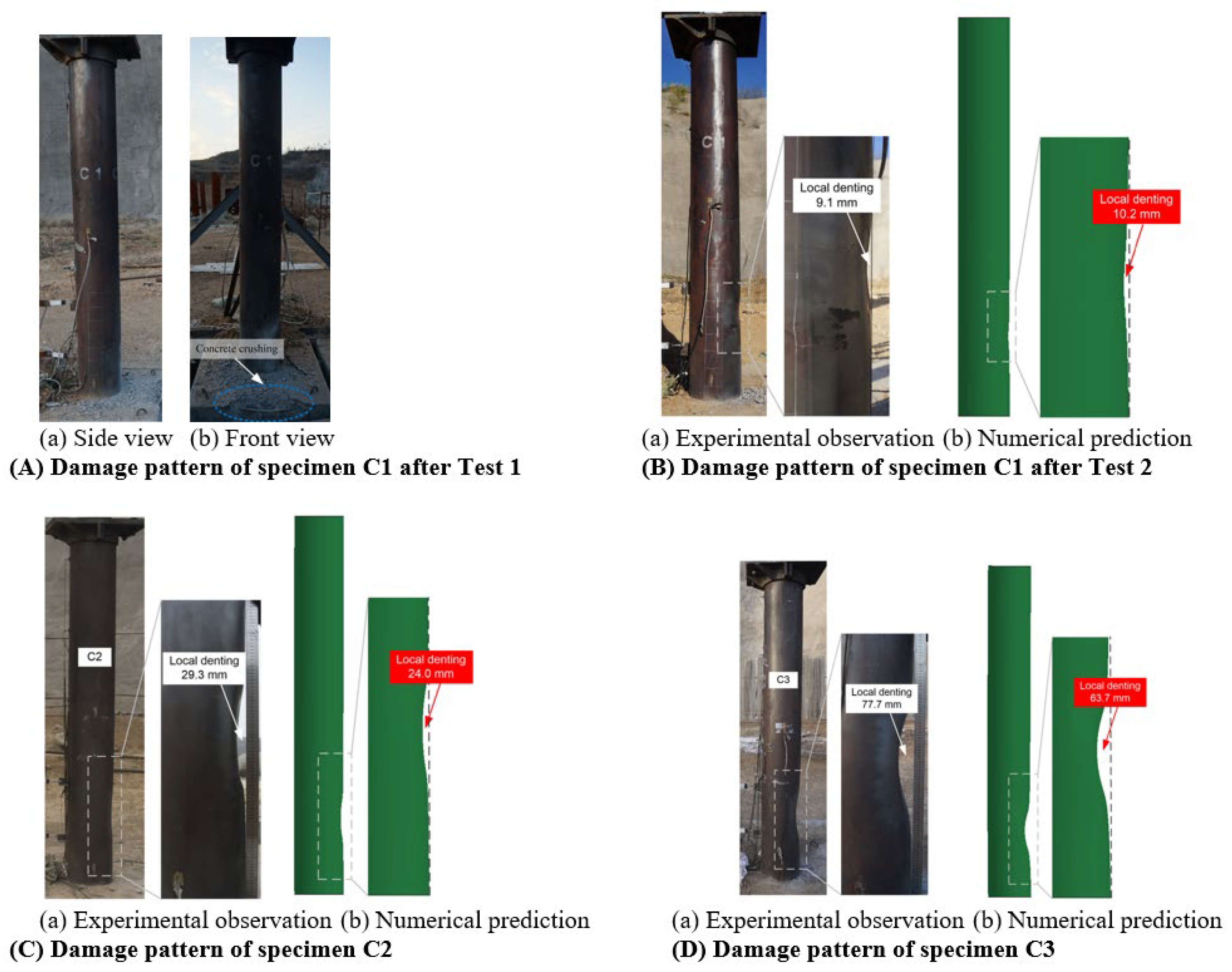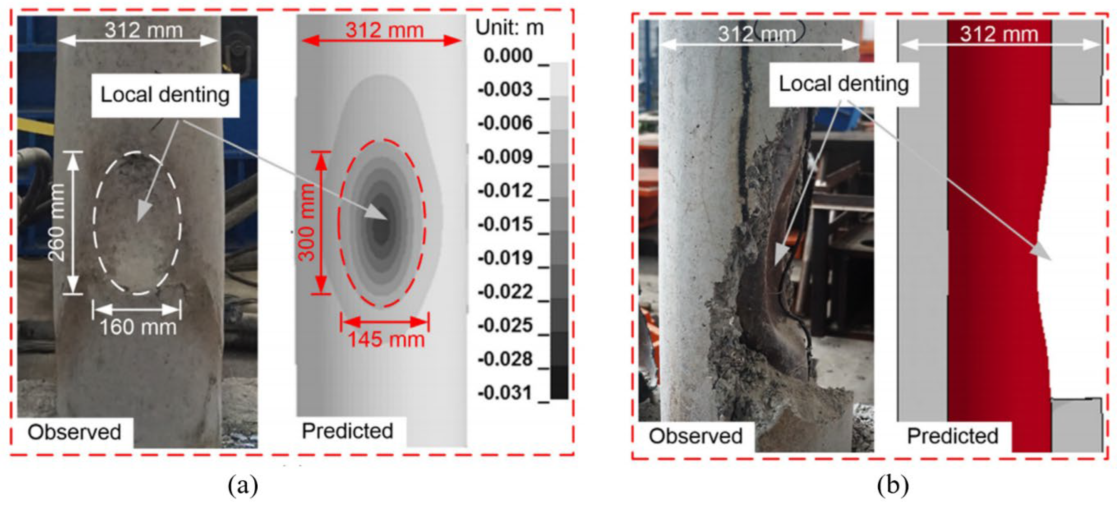 | 23 | Li et al. [113] | 2019 | Yes | Good | LS-DYNA | Karagozian & Case Concrete (KCC, Mat_Concrete_Damage_Rel3) | Denting deformation; damage; failure modes; plastic strain; damage dissipation energy | 1. Local axial deformation at top/bottom and lateral displacement due to buckling not considered. 2. No comparison with conventional circular RC column of equivalent capacity. 3. Parametric studies on concrete strength & steel tube thickness needed. |