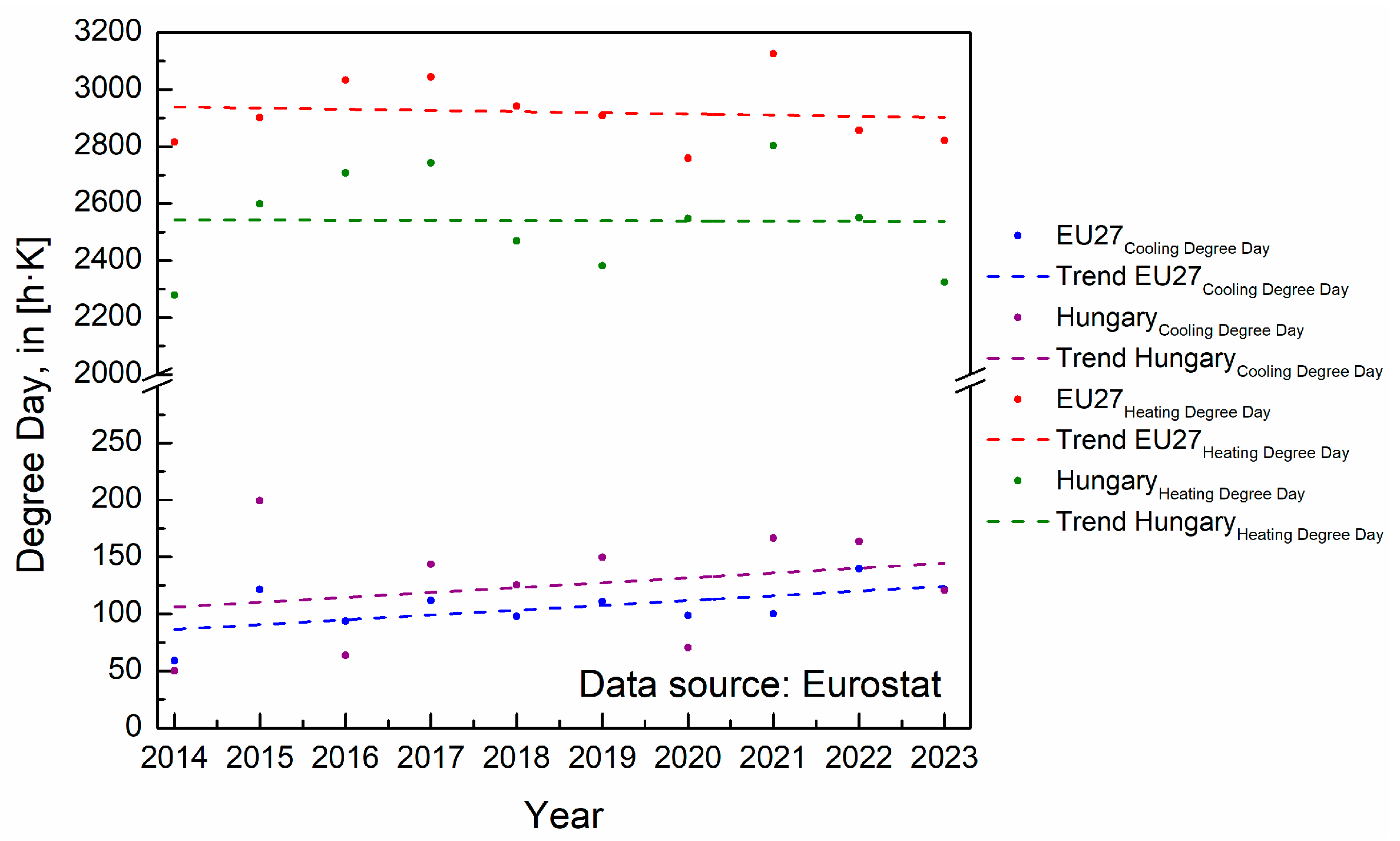 The 2010/30/EU directive [1] has exerted significant influence on the energy-related development of buildings. It emphasises passive design strategies [2], such as enhanced thermal insulation [3] and increased glazed surface areas [4]. These methods primarily aim to reduce heating energy demand and heating degree-day (‘DDH’) values. As a result, the thermal characteristics of both new and retrofitted buildings have improved significantly [5]. This design approach, however, introduces secondary effects that received limited attention from regulators. Improved insulation and increased airtightness contribute to substantial heat accumulation within buildings in summer periods [6]. Cooling degree-day (‘DDC’) values rise across the European Union [7,8], driven by climate change and intensified indoor heat accumulation. In Hungary, this tendency is particularly pronounced: DDH values decline while DDC values increase significantly, as illustrated in Figure 1.