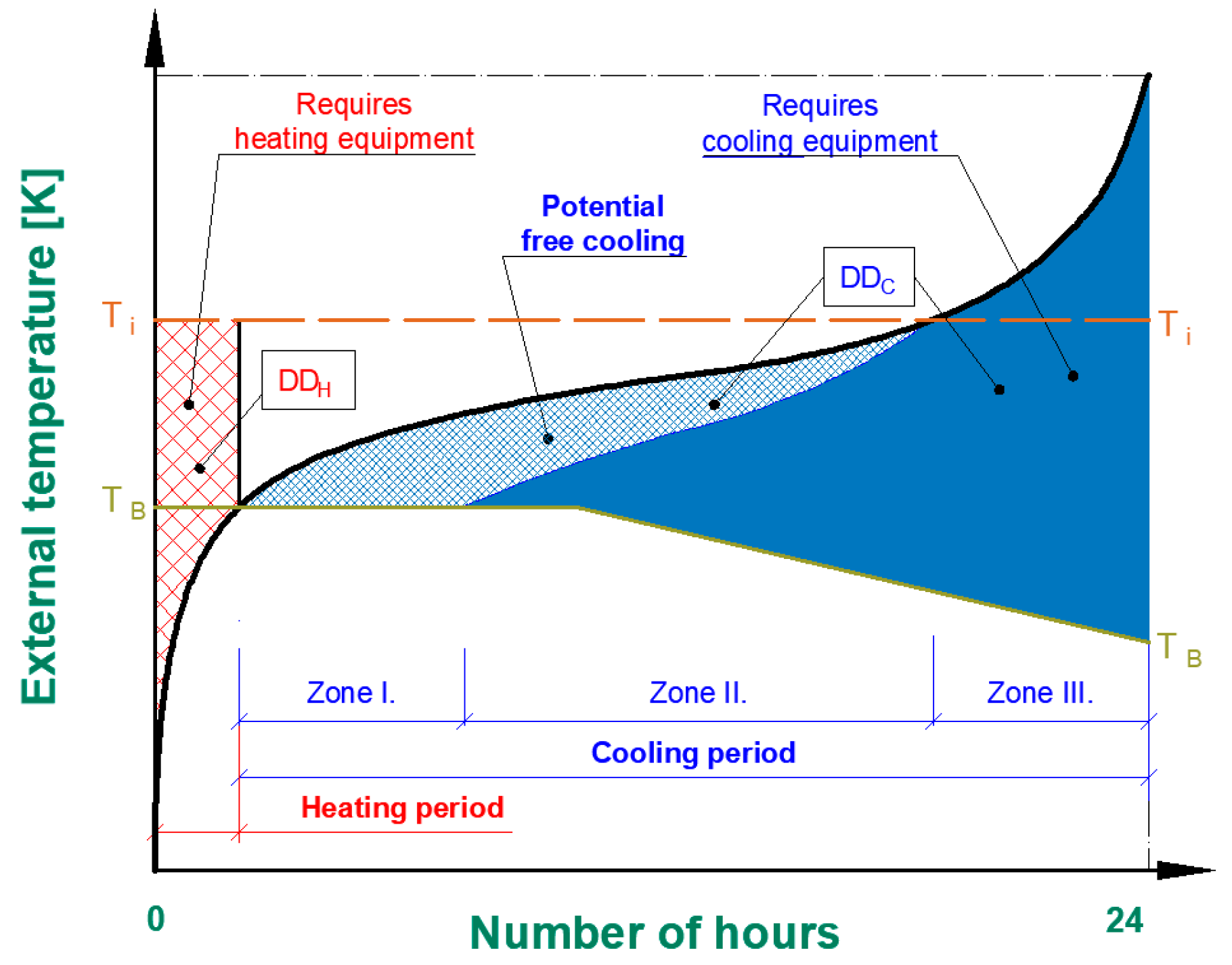 D D C = j = N c o o l i n g 8760 T e T B · d t ;         [ h K ]