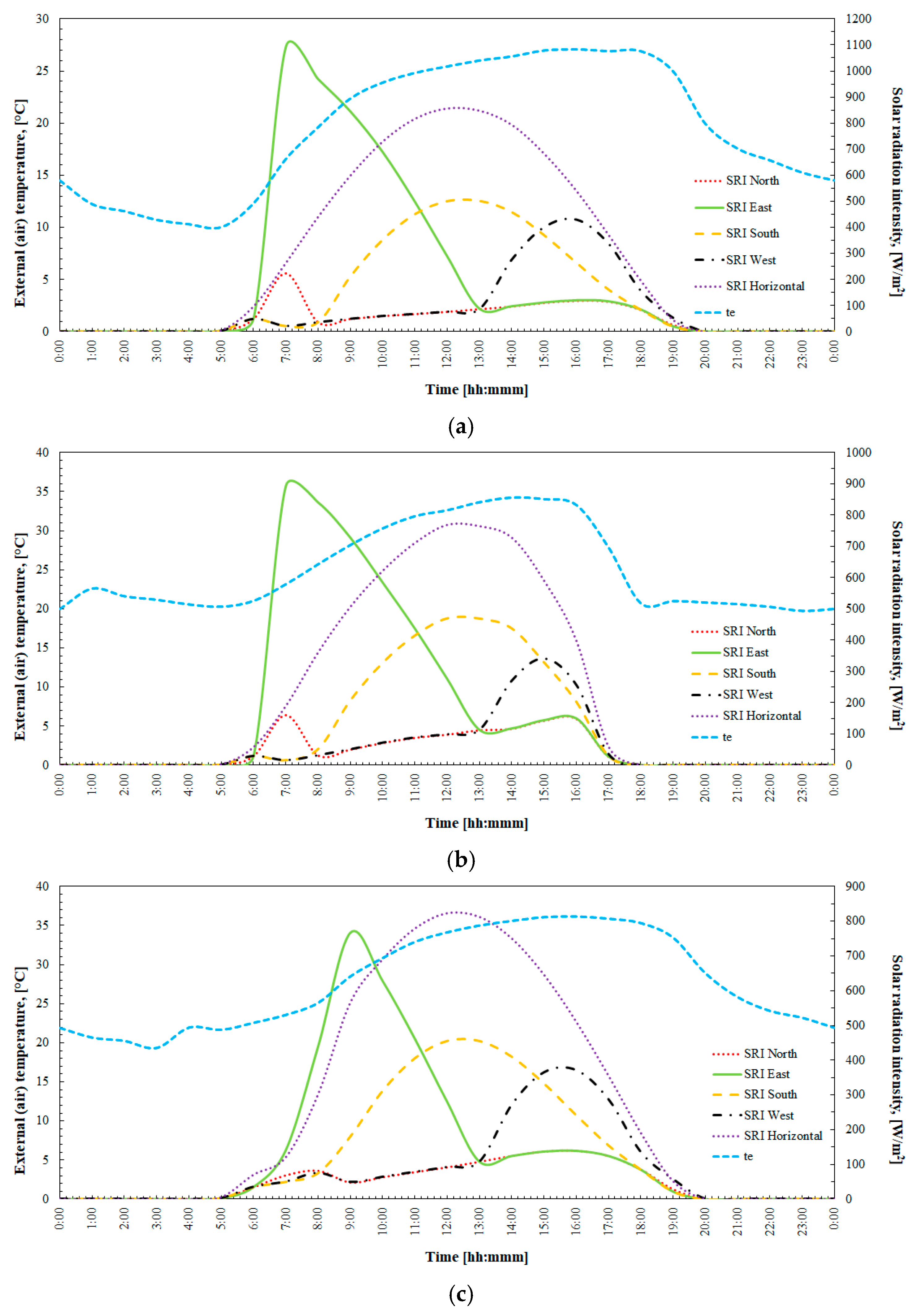 According to ISO 7730 [60], the Ti is 24.5 °C. Three meteorological day types (summer, hot, and extremely hot days (Summer/Hot/Extremely Hot Day: On a given day, the hourly average temperature is at least 25 °C, 30 °C, or 35 °C, respectively [4])) characterise periods relevant for free cooling. Selection relies on the Debrecen meteorological dataset from the period 2009 to 2019. For each year, the classification categorises all meteorological days into the three target types. Within each year, the procedure identifies the day with the maximum daily temperature fluctuation for each category. The selection process assigns, for each category, the year with the minimum daily temperature fluctuation in the final step. The second step selects days with high energy-saving potential, while the third excludes days with rapid weather changes (e.g., sunny morning followed by a rainy afternoon). Figure 6 demonstrates the selected days.