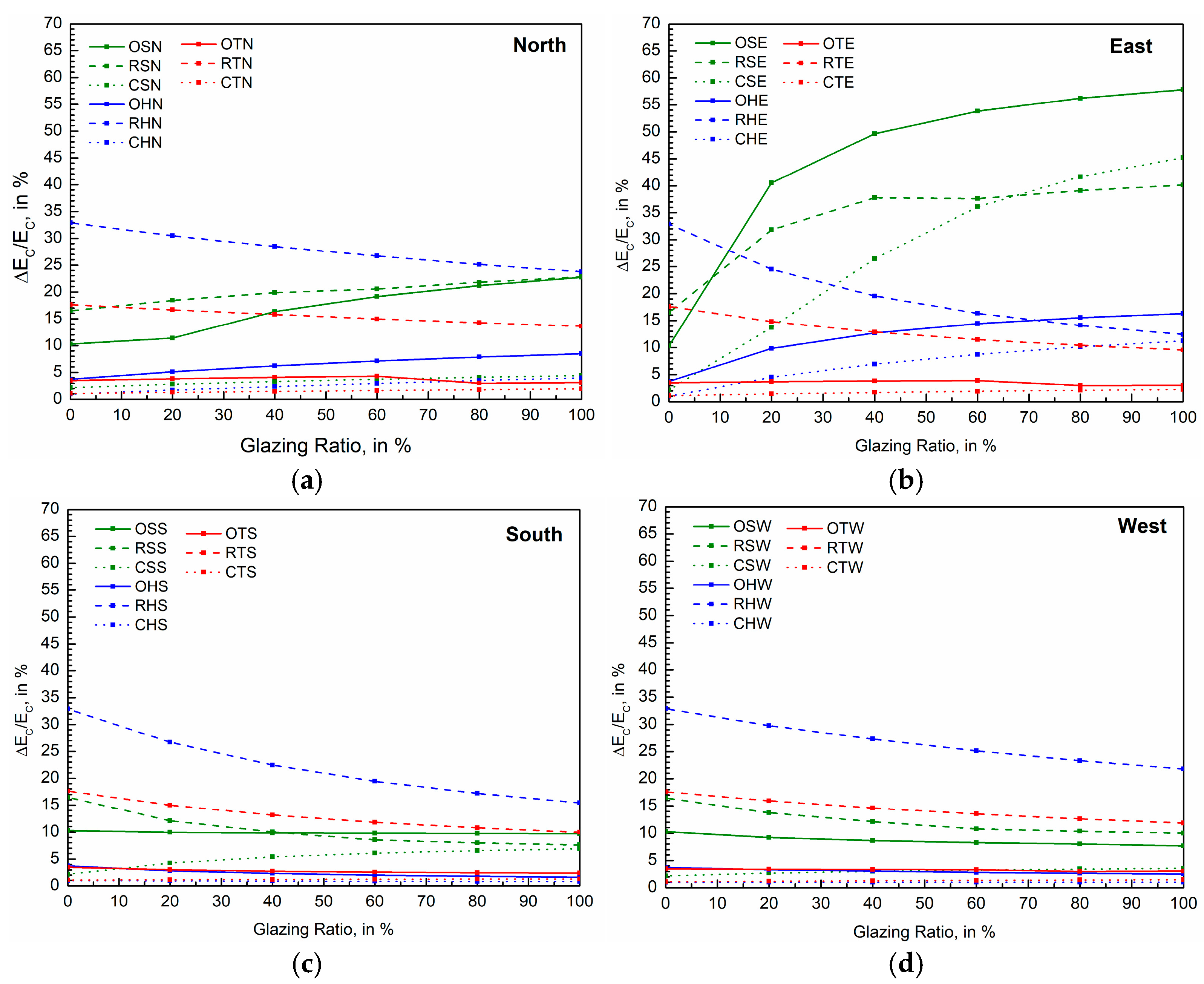 The first analysis examines ∆EC (as a proportion of the original mechanical cooling demand, EC) across different glazing ratios and orientations (EFC applied). Figure 7 presents the results (case notations as defined in Table 4):